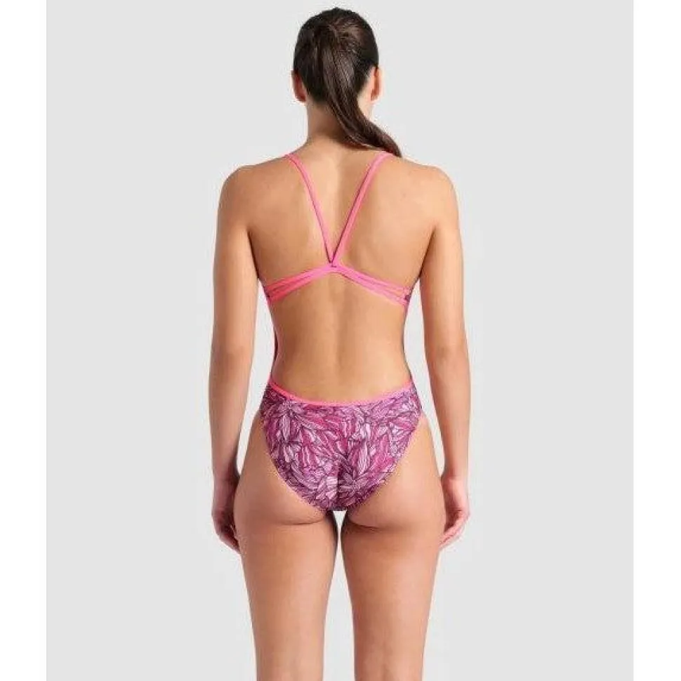 The arena Pink Dahlia Lace Back Swimsuit features a stunning floral pattern inspired by the delicate petals of the dahlia flower. The intricate design showcases a vibrant mix of pink and white, creating a mesmerizing visual effect that captures the eye.